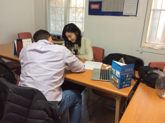 Eunhee studying with camera shy Kaina. Kaina joined us recently, but she tutors at the office even though she knows I will be taking photos.